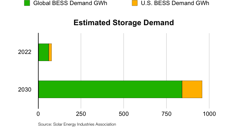Globally, total demand for batteries in all applications will grow from roughly 670 GWh in 2022 to over 4,000 GWh by 2030. Of that, global demand for battery energy storage systems (BESS), which are primarily used in renewable energy projects, is forecasted to increase from 60 GWh in 2022 to approximately 840 GWh by 2030. And US demand for BESS could increase over six-fold from 18 GWh to 119 GWh during the same time frame.[1]