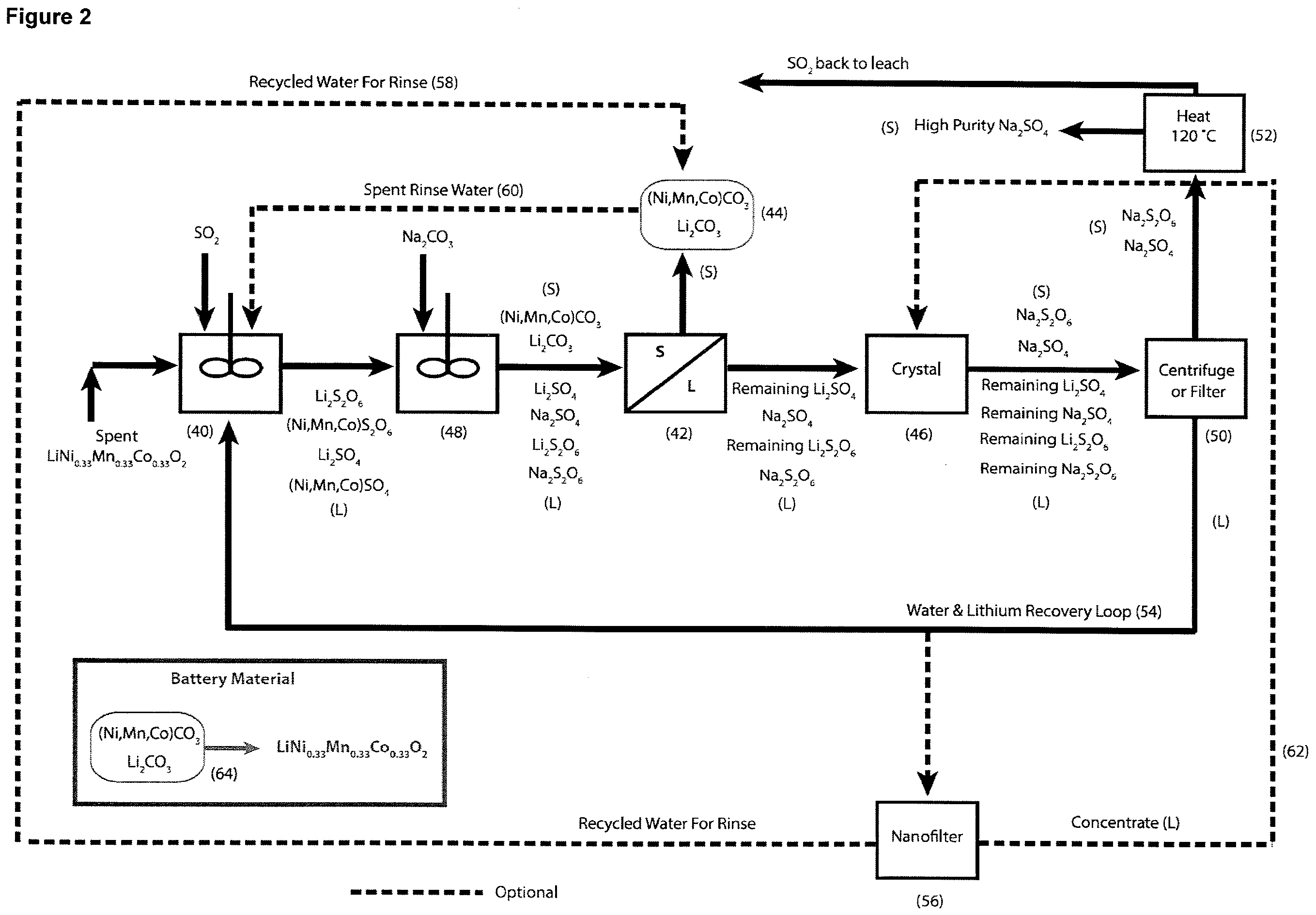 Second-pass purification: Lithium carbonate is redissolved in water and CO2 to form soluble lithium bicarbonate, leaving most impurities as solids for removal via filtration.